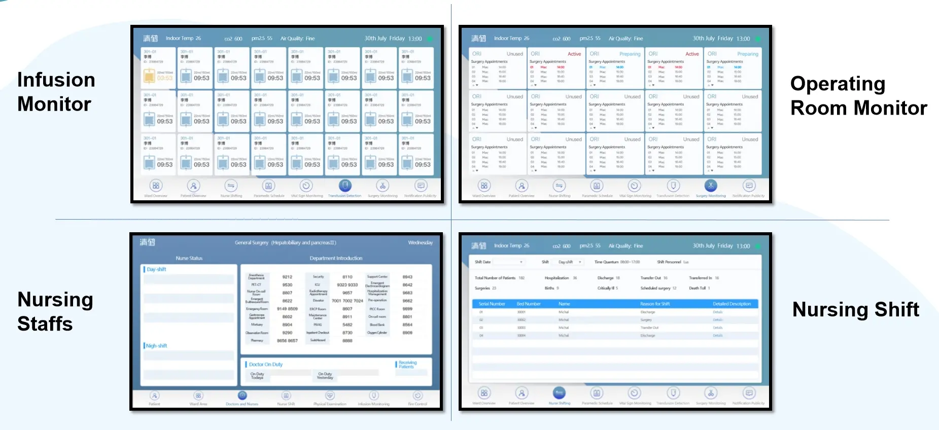 • Docking infusion monitoring, nursing system, real-time display monitoring, nursing and shift information.