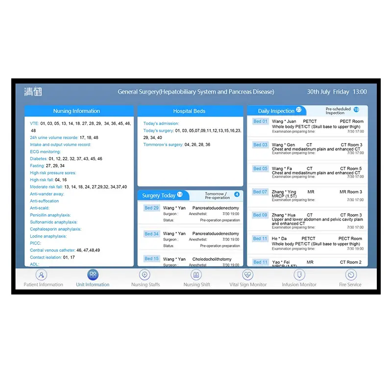 • The Nurse Station Information Screen can help hospital nurses extract the required data from mobile nursing background and related systems like HIS, and its function of central display allows nurses to monitor the patient’s dynamics, special conditions and nursing items. It is an important work of the hospital’s “Further Improvement In Healthcare” and a critical step in the construction of “Smart Hospital”.